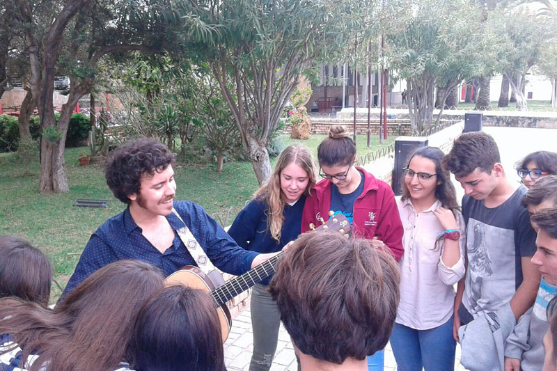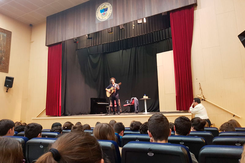Guillermo Alvah, para los alumnos de 3º y 4º de ESO, cantó canciones de sus dos discos ya grabados, hizo un avance de su próximo disco y acabó sacando a escena a algunas alumnas que cantaron con él.
