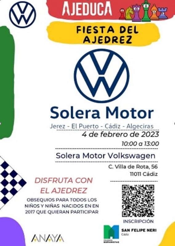 El próximo sábado 4 de febrero se va a realizar la Fiesta del Ajedrez, en colaboración entre Solera Motor, Colegio San Felipe Neri y Ajeduca (Ajedrez y Educación).