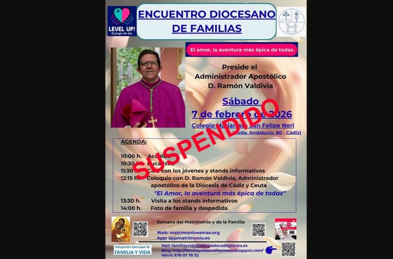 La Diócesis de Cádiz y Ceuta informará sobre una posible nueva fecha para la celebración del Encuentro Diocesano de Familias y ha agradecido la comprensión de todas las personas inscritas ante esta suspensión motivada por causas meteorológicas.